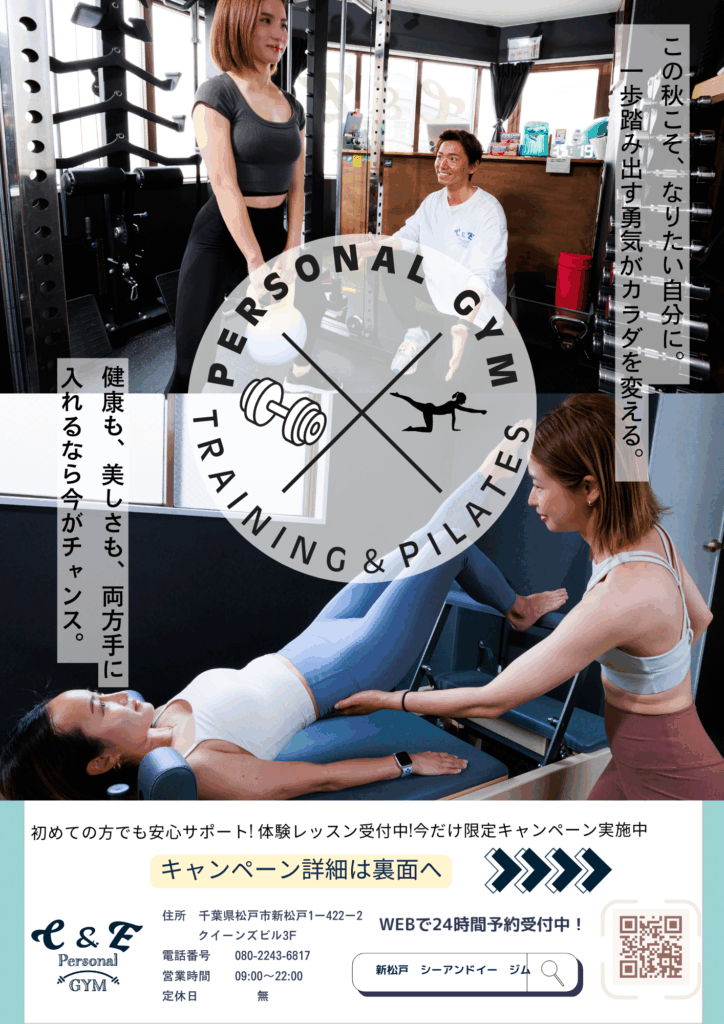 秋は、暑すぎず動きやすい「身体を変えるのにぴったりの季節」夏の疲れが残ったまま冬に入る前に、姿勢や代謝を整えておきませんか? C&E Personal GYMでは、パーソナルトレーニング&ピラティスを通して、「体の変化を実感できる秋」にしていただけるよ...